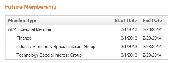 The Future Membership control displays a list of a constituent's future memberships. See Configuring the Web Settings for the Future Membership Control for more information on how to drop this control onto a page on your e-Business website.